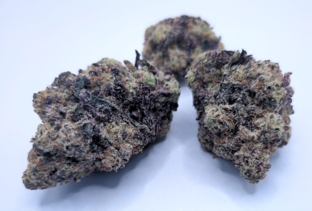 Red Bullz is a sativa dominant hybrid strain (70% sativa/30% indica) created through crossing the classic Grape Gas X White Runtz strains. Deliciously potent with all of the energy that you’ll find in your favorite like-named beverage, Red Bullz is a great choice for any wake-and-bake. The high hits you fast and hard, slamming into your brain with high-flying energy that will instantly get you out of bed or off of the couch. You’ll feel creative and infused with a sense of focus that activates your senses and helps you really get to work. A light physical arousal accompanies this happy boost, so better be prepared in case anything happens! Red Bullz is often chosen to treat a variety of conditions including chronic fatigue, depression, chronic stress, mood swings, ADD or ADHD and chronic pain. This bud has a sweet and fruity sugary grape flavour with a light touch of diesel and candy upon exhale. The aroma is very similar, with a tropical fruity overtone accented by sugary grapes and a punch of diesel. Red Bullz buds have dense rounded bright neon green nugs with deep blue undertones, thick orange hairs and frosty dark blue-tinted white crystal trichomes.